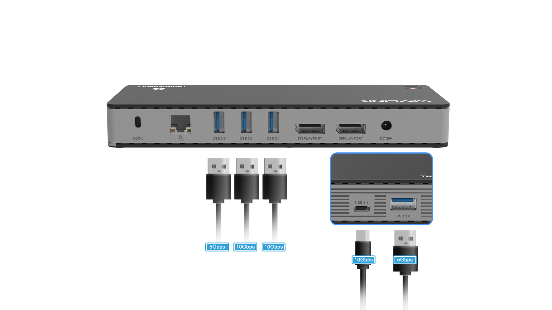 UTD21 owns five USB ports——one Type-C port and four USB-A ports, two of them are USB3.0 ports that provide data transfer at maximum 5Gbps; the other three are USB3.1 ports with data transfer up to 10Gbps, you can connect both Type-A and Type-C peripherals.