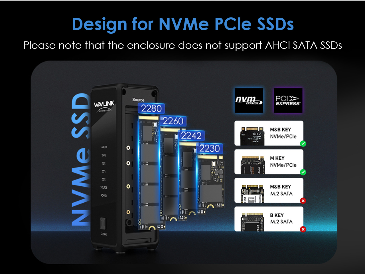 To make the SSD operate smoothly and successfully, you need to select the compatible type of SSD first, it is compatible with NVMe in sizes 2280/2260/2242/2230,and only compatible with M-Key, M&B-Key connectors.