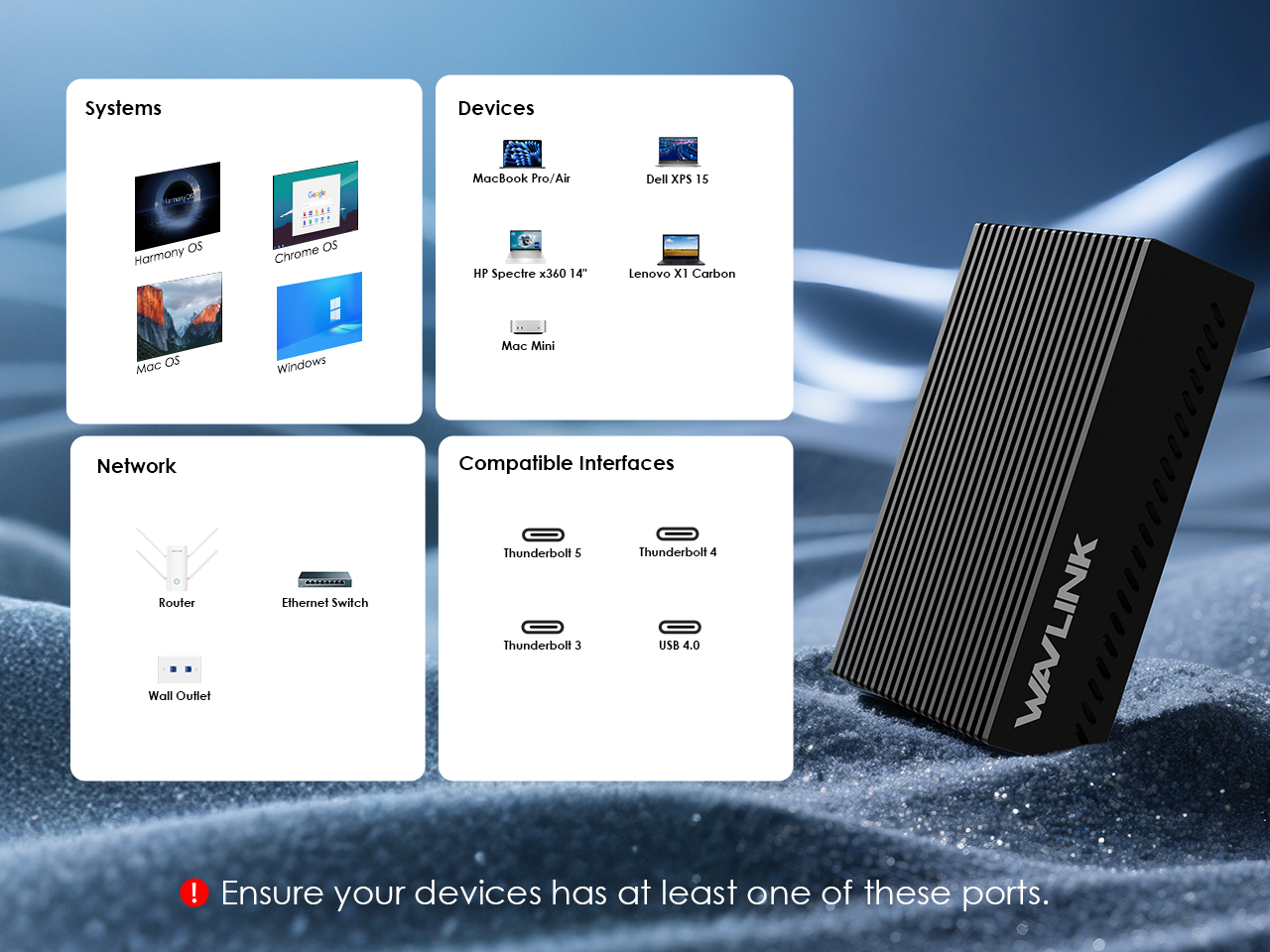 Supports major operating systems and devices including MacBook, Dell, HP, Lenovo, and more. Connects via Thunderbolt 3/4/5 or USB 4.0 ports. Verify your device has the required interface before use.