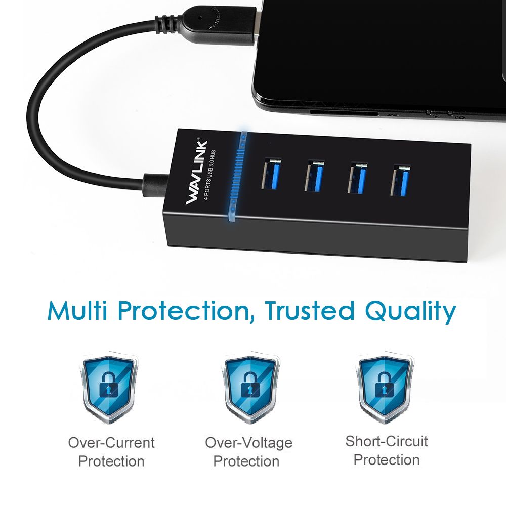 The built in sturdy cable reinforces the USB 3.0 interfaces, without slipping, falling out when on work. Built in over voltage, over current, leakage and short-circuit protection units protect your devices safe at any time.