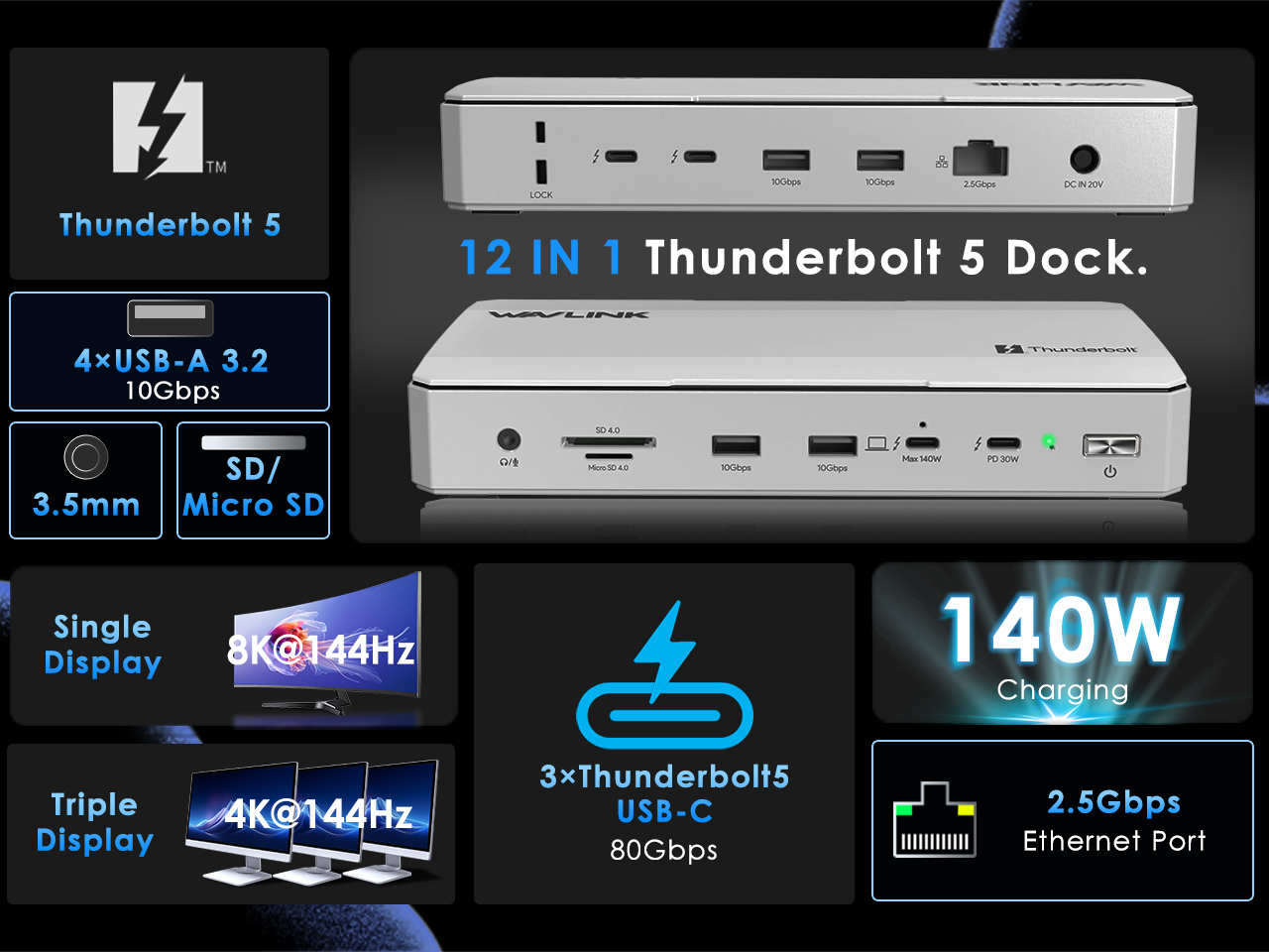 Discover the official WAVLINK Thunderbolt 5 Dock. Experience up to 120Gbps bandwidth, 140W PD 3.1 fast charging, multi-display support for Mac & Windows, and a full suite of high-speed ports.