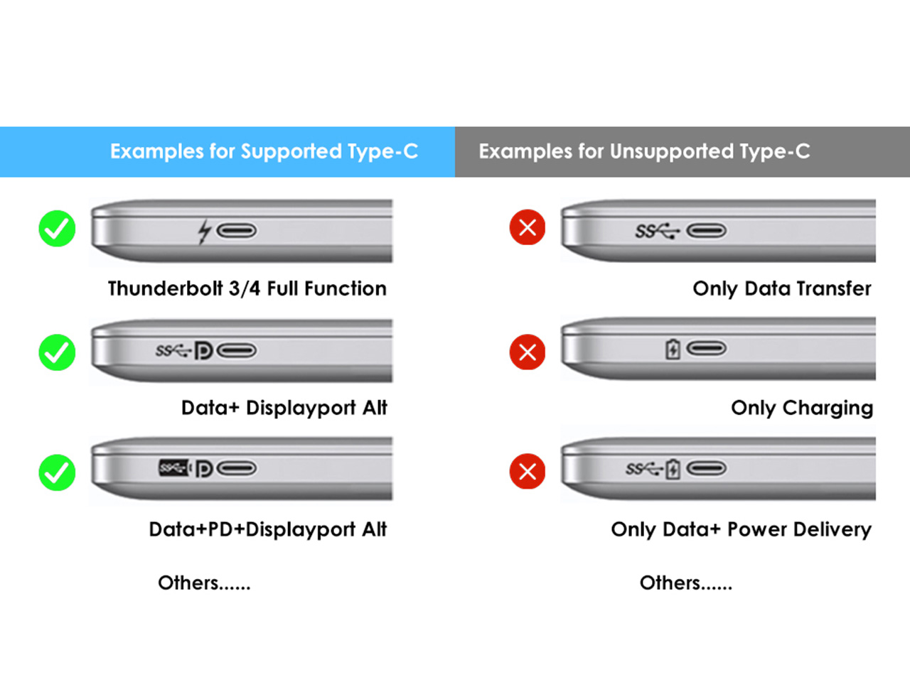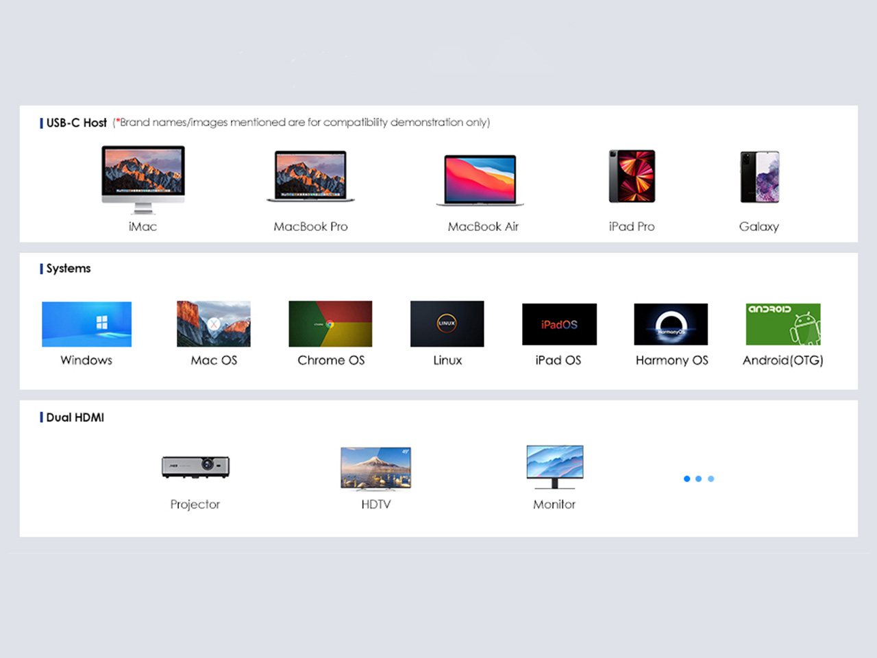 Designed for devices with full-featured USB-C ports that support both DisplayPort Alt Mode and Power Delivery. It offers broad compatibility with a range of laptops, tablets, and smartphones running Windows, macOS, Android, and other major operating systems. Please be advised: video output and external display support vary by device—please verify your USB-C port's specifications prior to use.