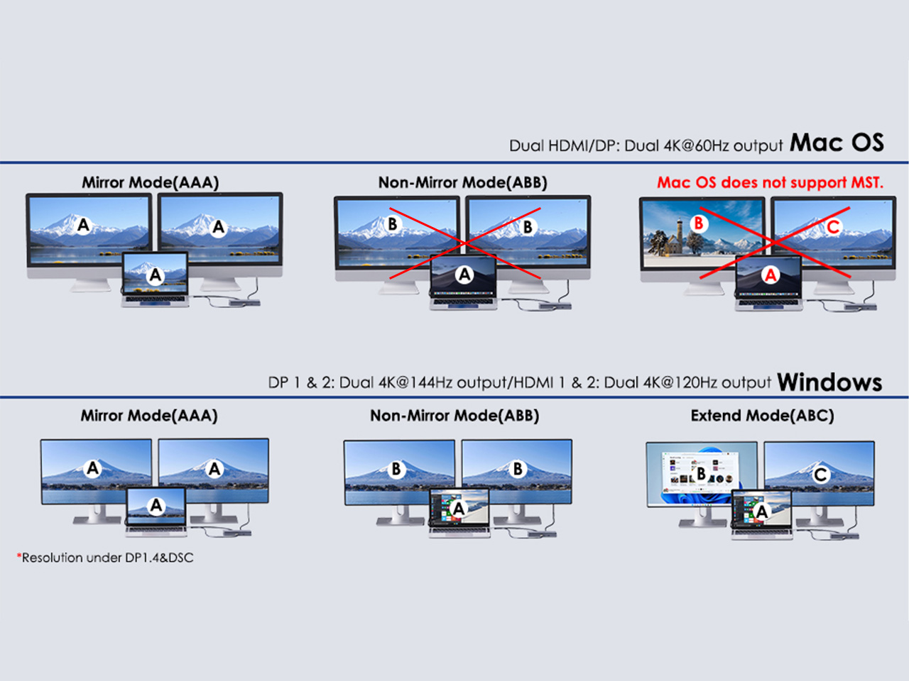 | macOS | Mirror: Dual 4K@60Hz | Mirror: Dual HDMI/DP 4K@60Hz | |