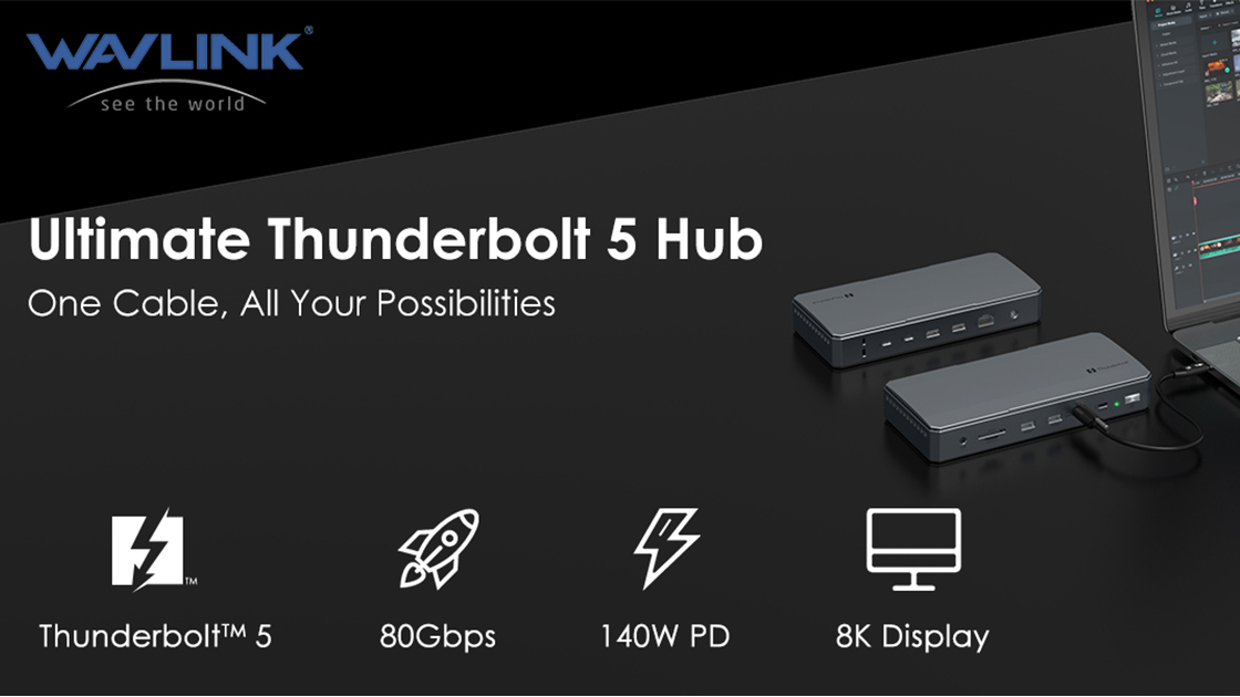 Discover the official WAVLINK Thunderbolt 5 Dock. Experience up to 120Gbps bandwidth, 140W PD 3.1 fast charging, multi-display support for Mac & Windows, and a full suite of high-speed ports.