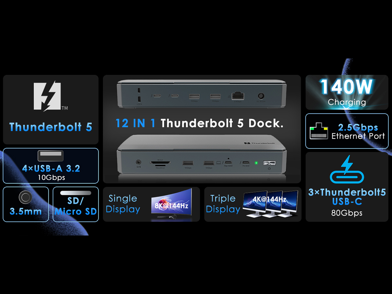 This 12-in-1 features Thunderbolt 5,high-speed USB-A 10Gbps, 2.5Gbps Ethernet, and a UHS-II card reader, connecting all your essential devices through a single cable.