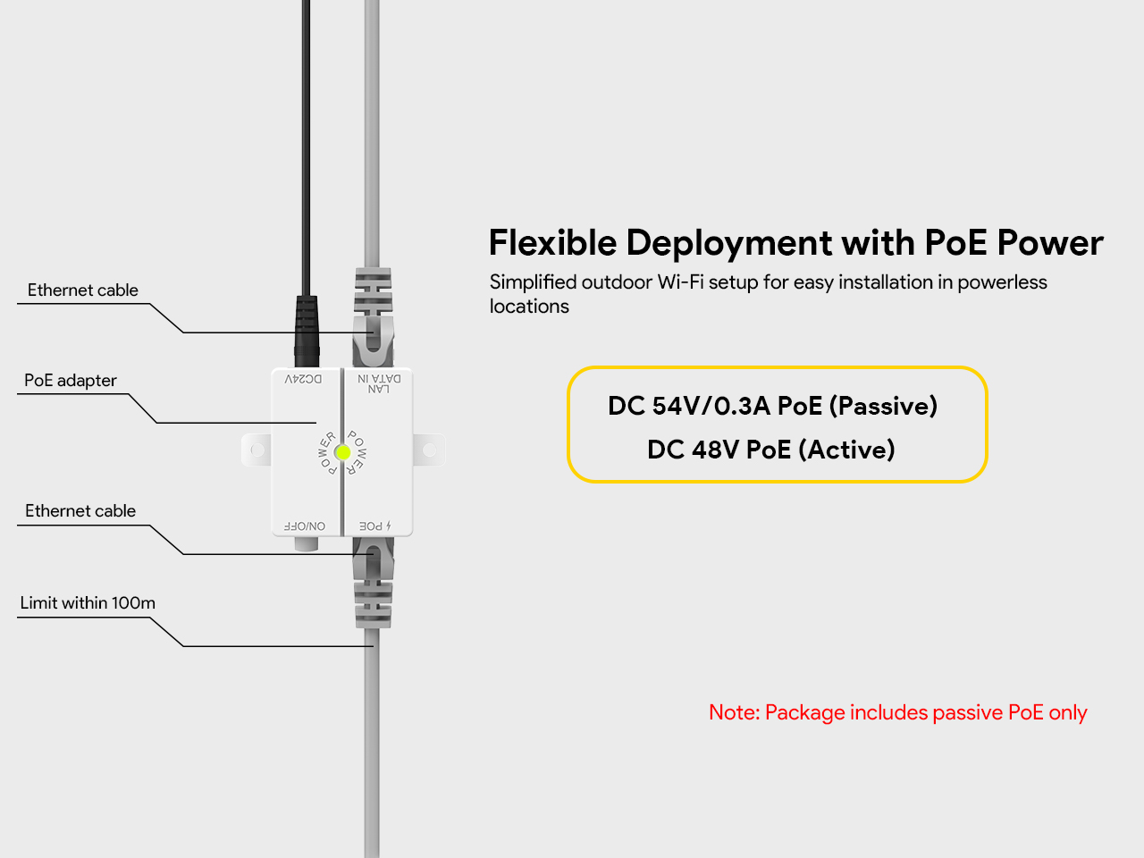 Input: 100-240V ac,50/60 Hz DC 54V/0.3A Power over Ethernet (Passive) DC 48V Power over Ethernet (Active) |