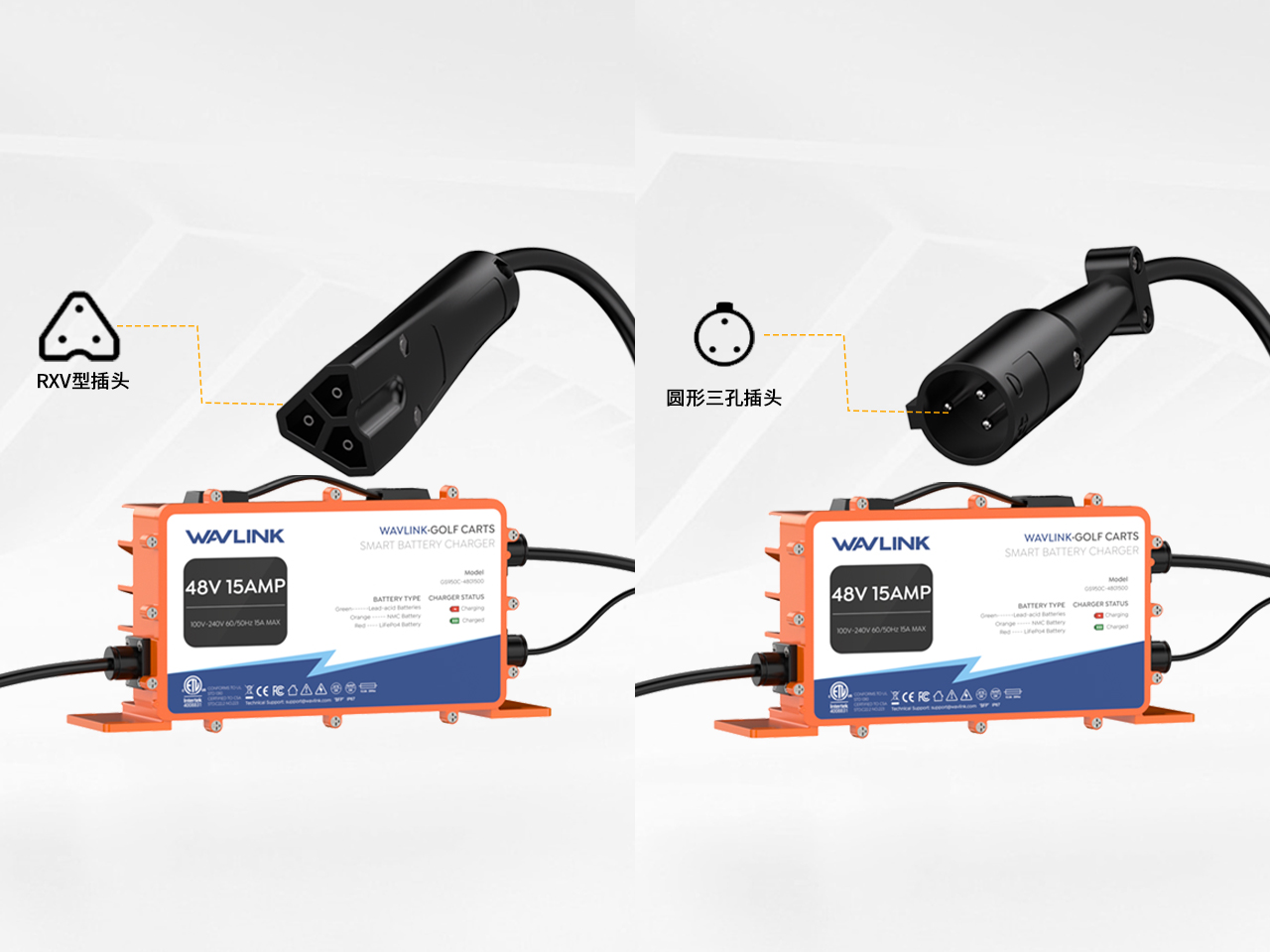 可适配铅酸电池、磷酸铁锂电池及三元锂电池。购买前,请务必确认你的充电孔类型与之匹配。 注意:本设备不适用于2014 年及更早配备车载计算机(OBC)的Club Car车辆,除非您先绕过或者断开OBC模块。