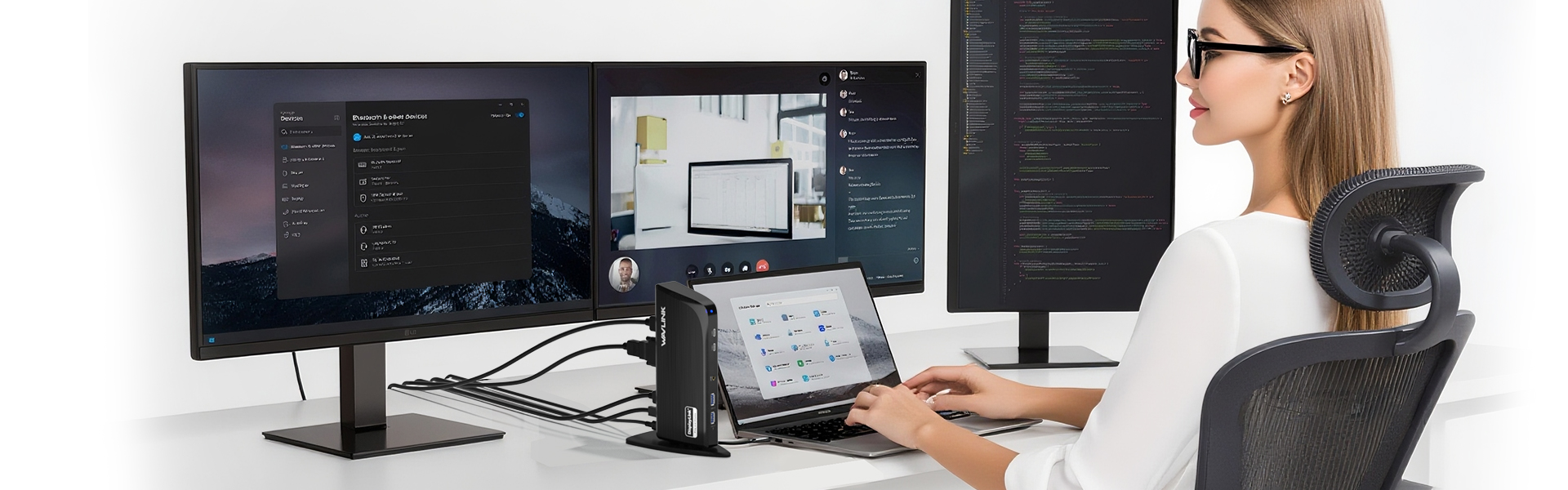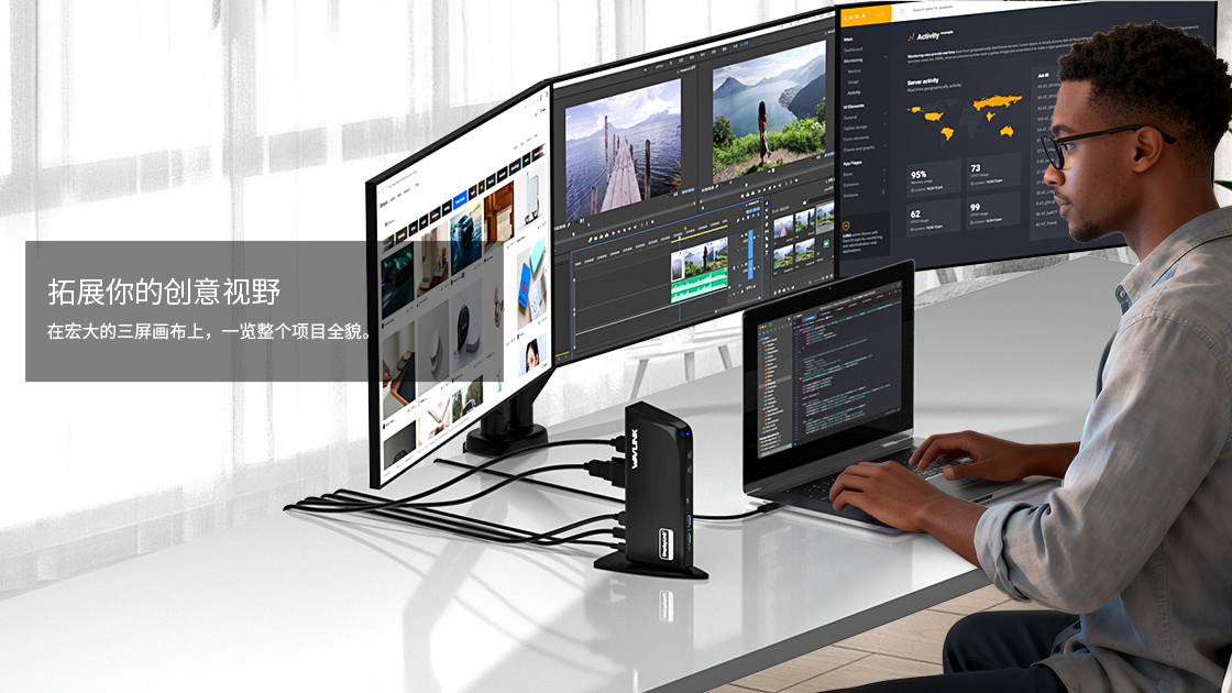 将你的笔记本变成强大的工作站 —— 三屏显示、高速接口与无缝连接,一体尽享。