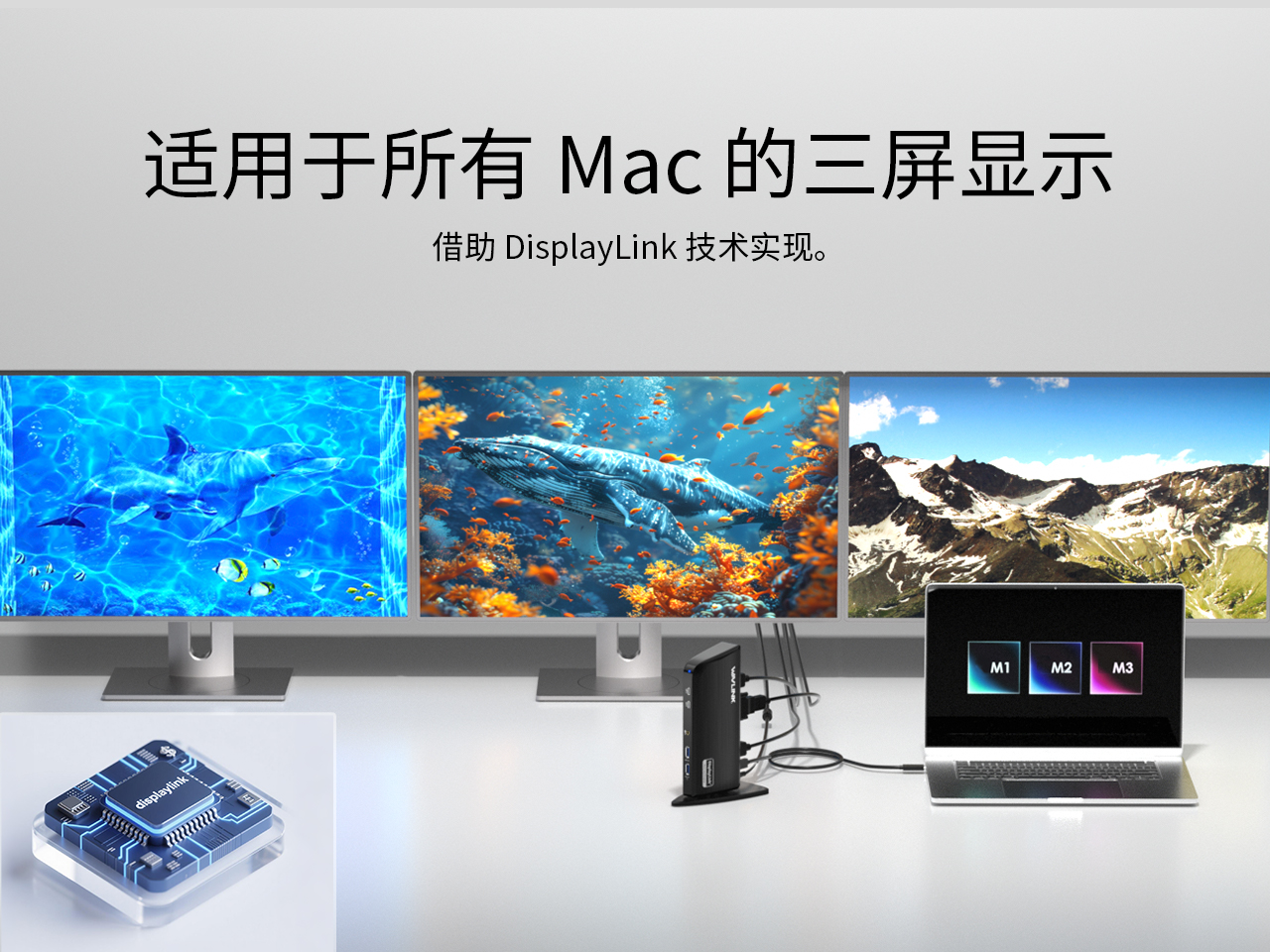 搭载DisplayLink技术,我们的拓展坞突破了Mac的原生显示限制。即使是M1/M2/M3芯片的MacBook,也能轻松连接三台拓展显示器,实现极致生产力。