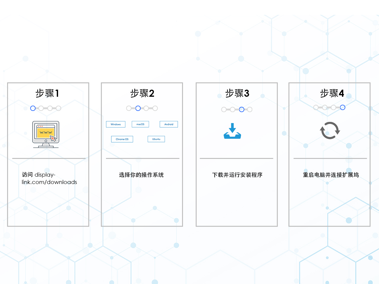 只需几分钟即可完成设置。访问DisplayLink官网下载最新驱动,安装后重启电脑,然后连接您的拓展坞。就是这么简单。