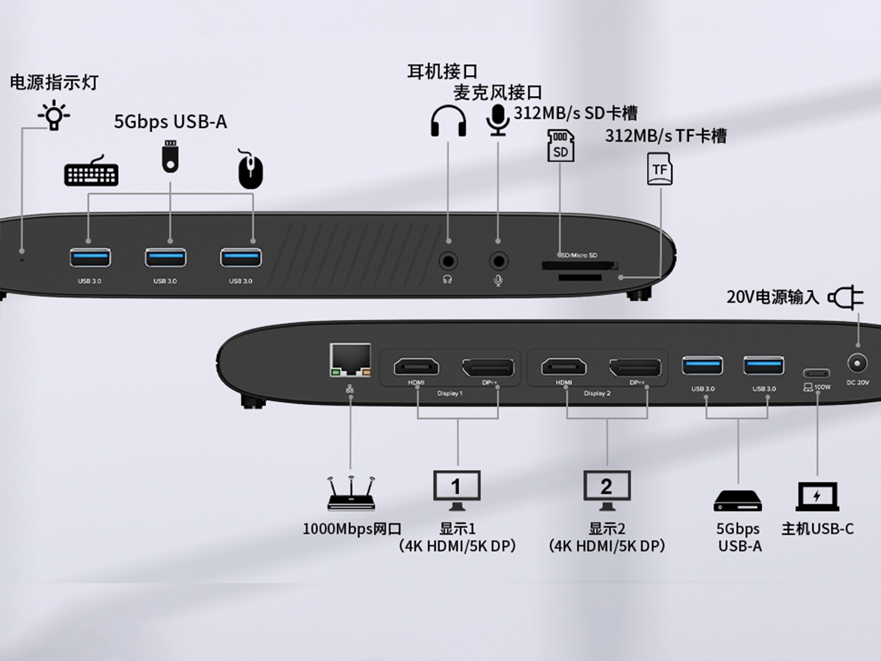 | 接口 | 直流电源接口;USB-C;2个HDMI;2个DP;5个USB3.0 Type-A接口;4极耳机接口;RJ45网络接口;SD/TF卡槽 | 工作标准 | 1. USB-C输入:USB3.1 Gen2(数据传输、Alt-Mode模式及PD充电) 2. DP/HDMI:最高4K/60Hz 3. USB-A接口:5Gbps 4. USB-A接口:5Gbps;支持BC1.2充电 5. RJ45:千兆以太网 6. SD/TF:SD V4.0 7. 4极耳机接口:TRRS/立体声 |