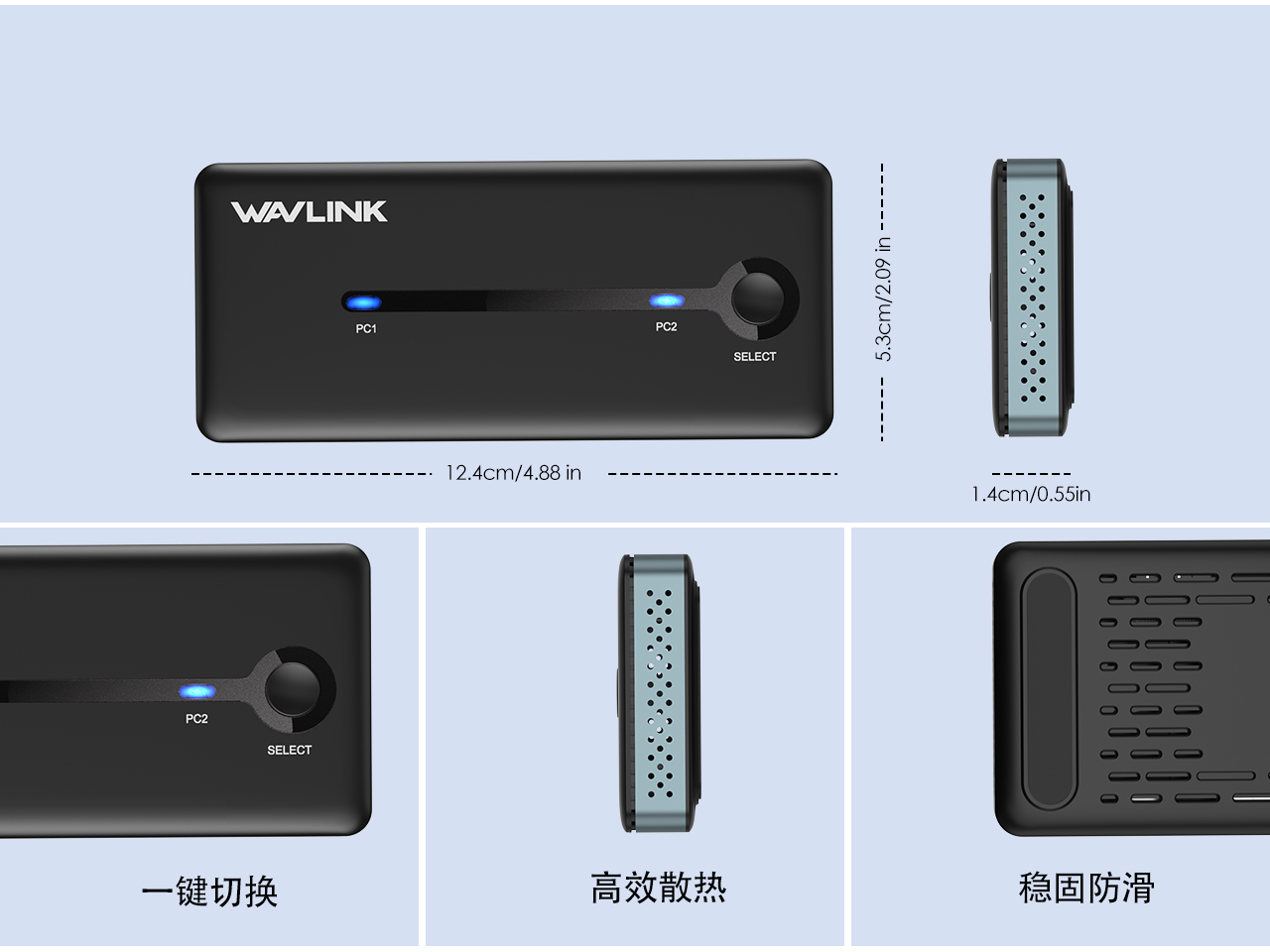 此KVM交换机小巧便携,可轻松放入您的口袋或包中。其设计注重便携性和移动性。只需一个按钮即可轻松切换电脑。散热孔和防滑垫设计极大地提升了用户体验。