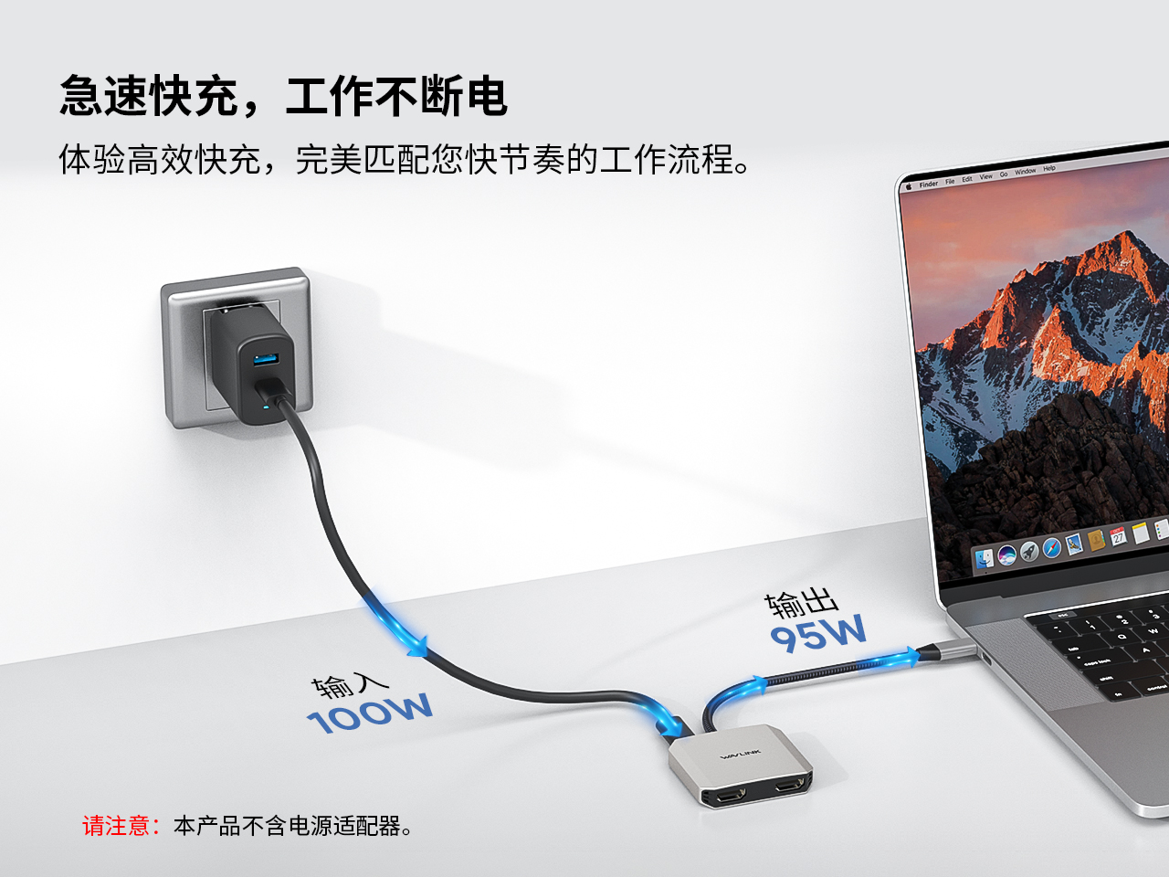 轻松将您的USB-C笔记本拓展至两台4K@60Hz高清显示器,同时通过95W PD端口为其全速充电。即插即用,是打造高效、整洁双屏工作站的理想之选。