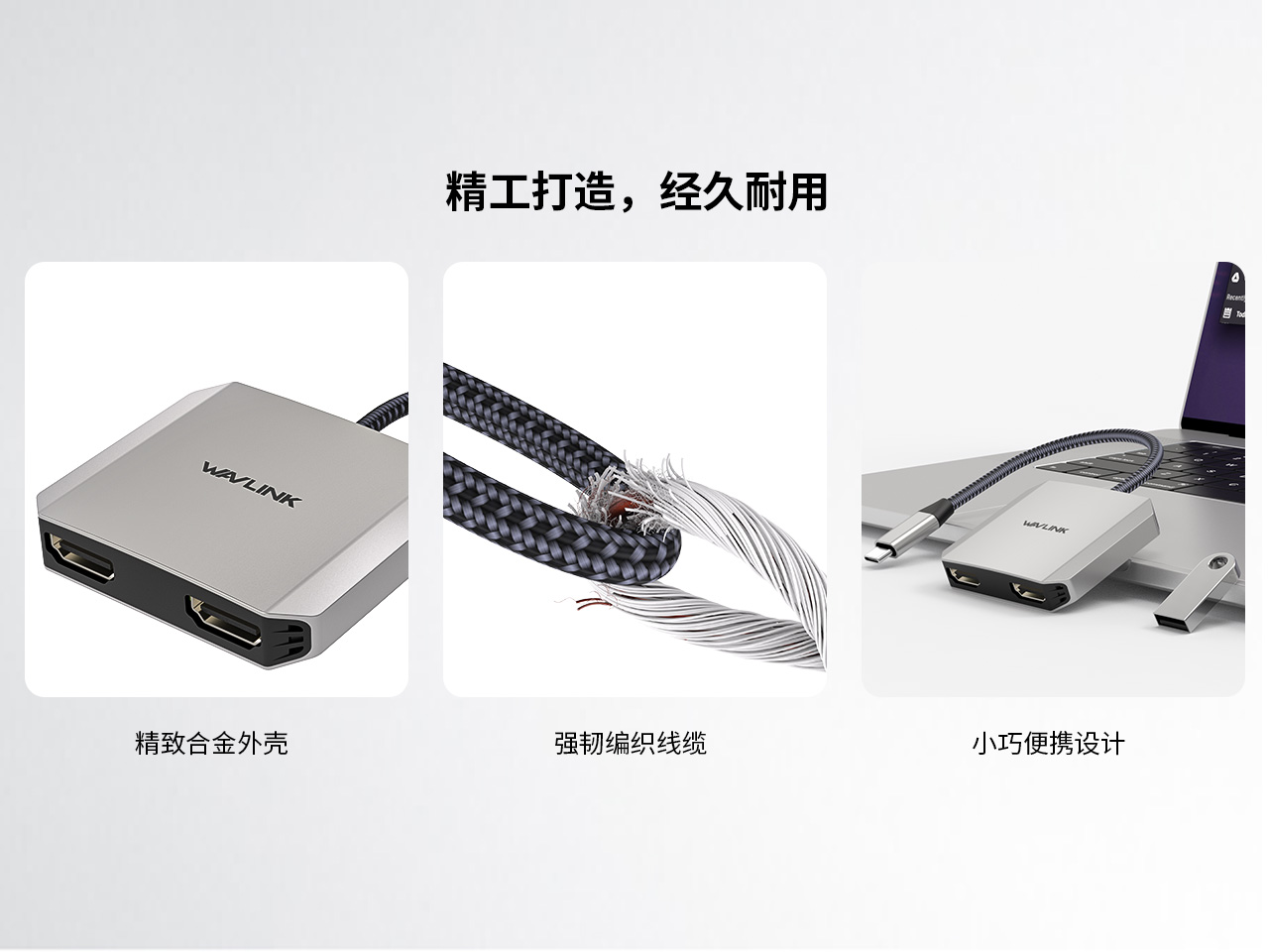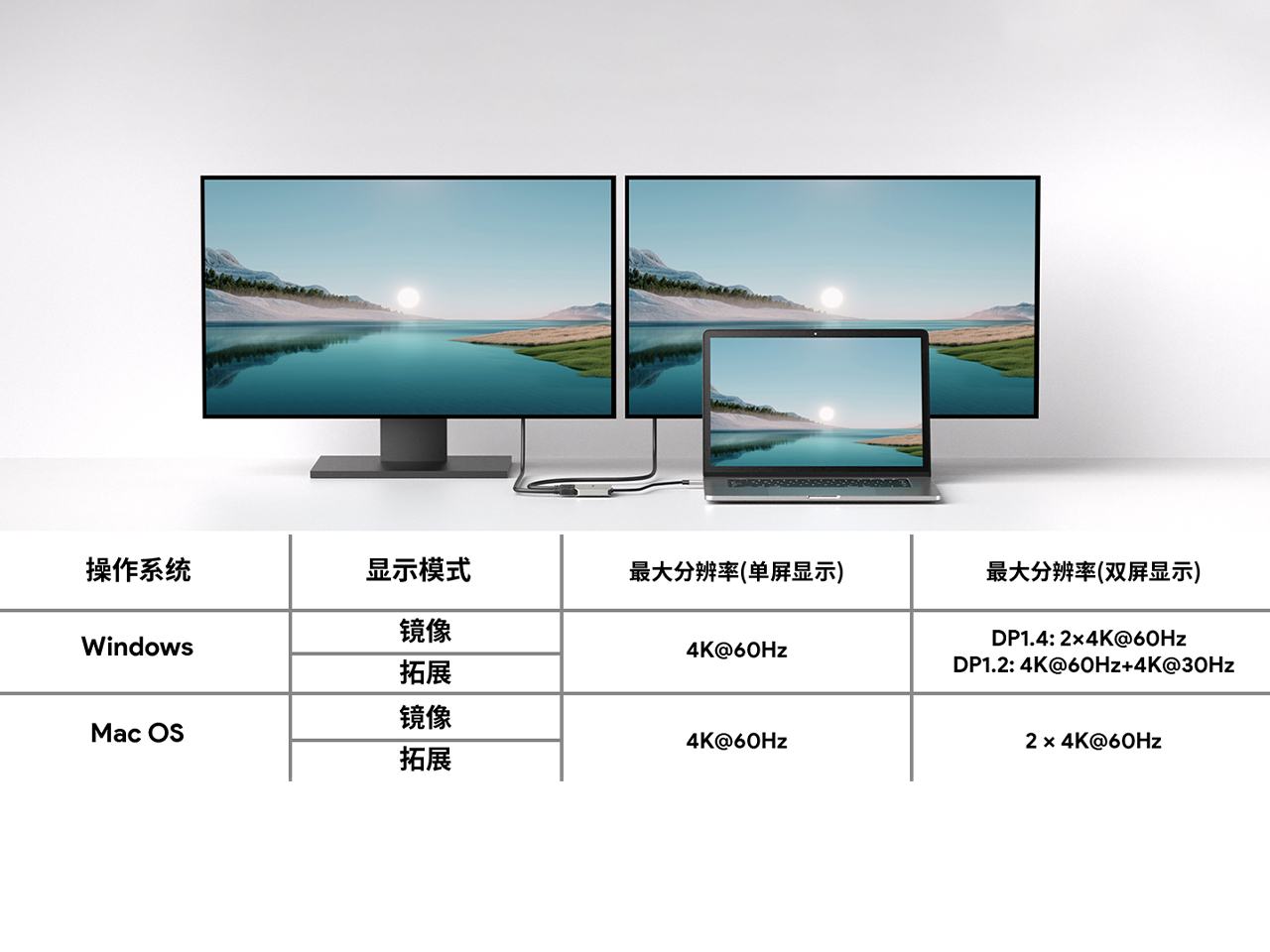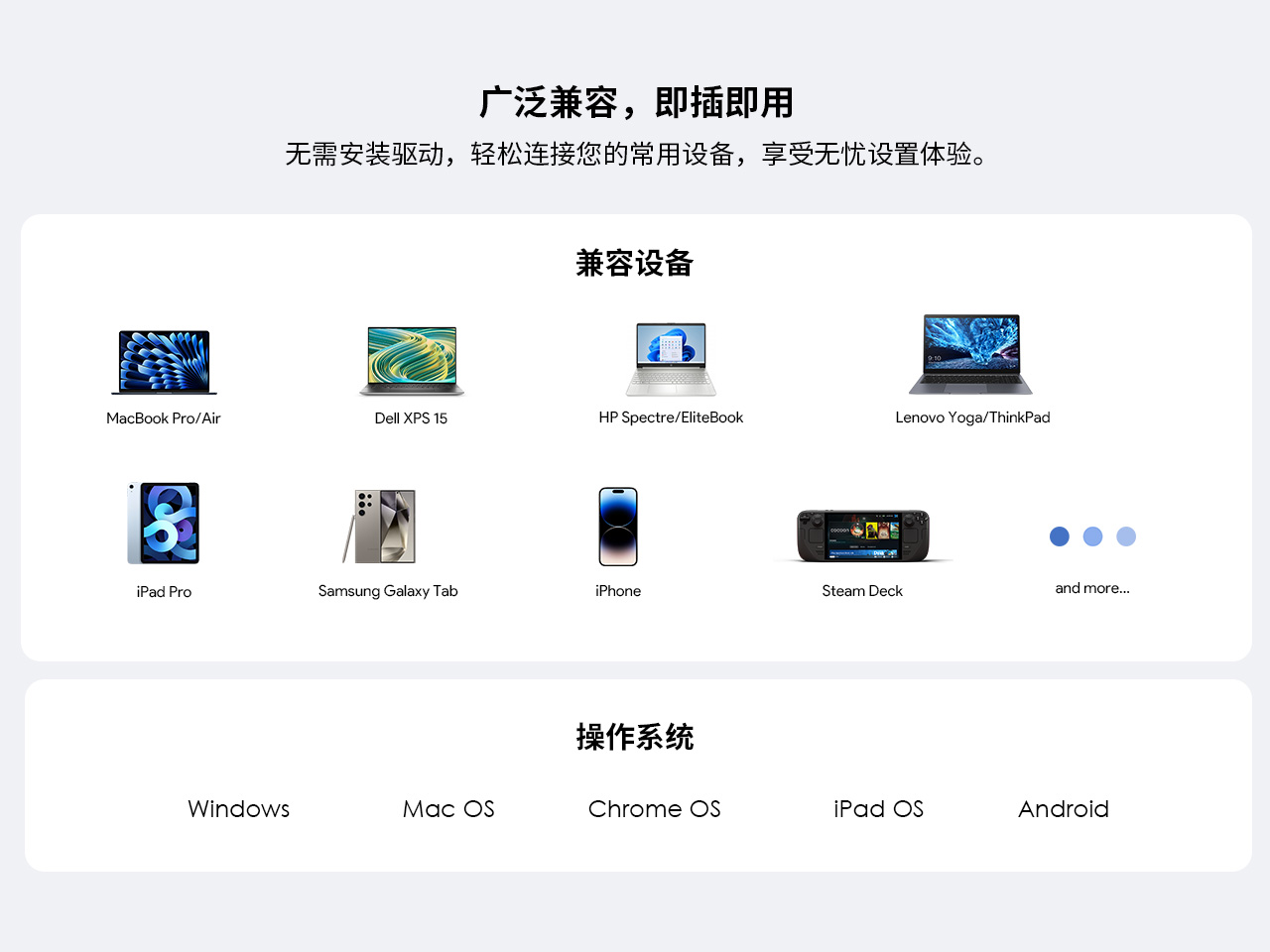广泛兼容各类支持视频输出的USB-C设备(兼容雷电3/4)。无需安装驱动,链接即可使用,进项无缝衔接的便捷体验。