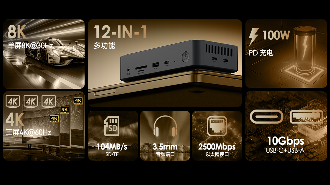 | 支持操作系统 | Microsoft Windows 10/11 Apple Mac OS 11 或更高版本(仅支持扩展另一台显示器) 笔记本电脑/台式机至少配备一个支持视频替代模式和数据传输的 Thunderbolt 3/4/5 或全功能 USB-C 端口 使用 PD 功能需笔记本电脑支持 PD 3.0 协议 |