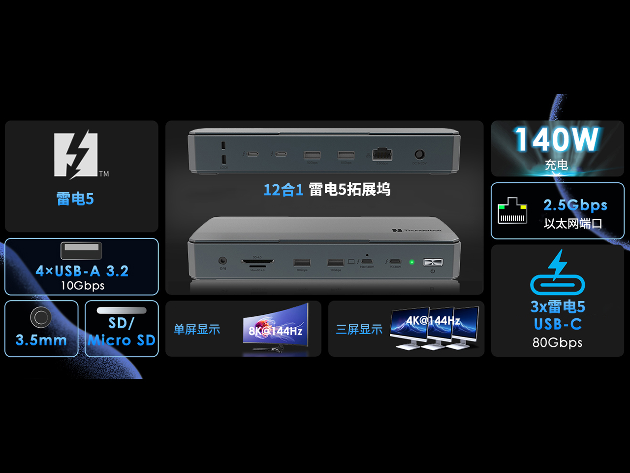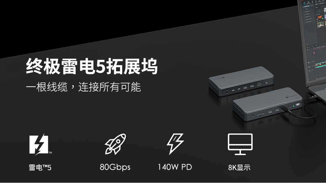 -1个雷电™5上行接口提供80Gbps数据传输、120Gbps的带宽传输,并为USB-C笔记本提供140W即时充电。