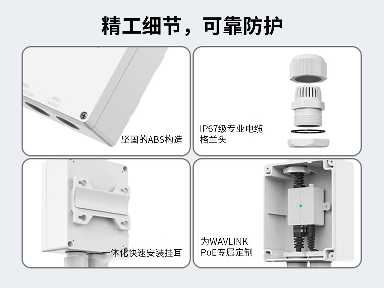 我们保护盒的每一处细节都为卓越的防护和易用性而精心设计。从坚固、抗UV的ABS盒体到专业级的电缆格兰头,每个组件协同工作,创造一个安全的环境。其内部空间更是为您的WAVLINK PoE专属定制、确保完美、稳固的贴合。