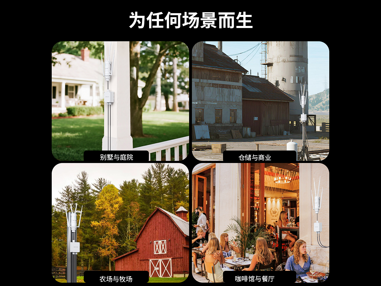 无论您是想将Wi-Fi拓展到后院、保护仓库安全、监控农场,还是为咖啡馆的露台提供网络连接,我们的户外保护盒都是完美的解决方案。坚固和专业的设计能无缝融入任何住宅或商业环境。