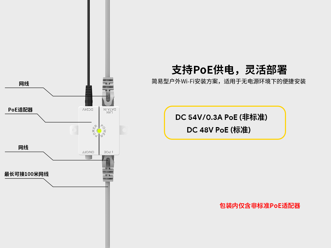 输入:100-240V ac,50/60Hz DC54V/0.3A PoE(非标准) DC48V PoE(标准) |